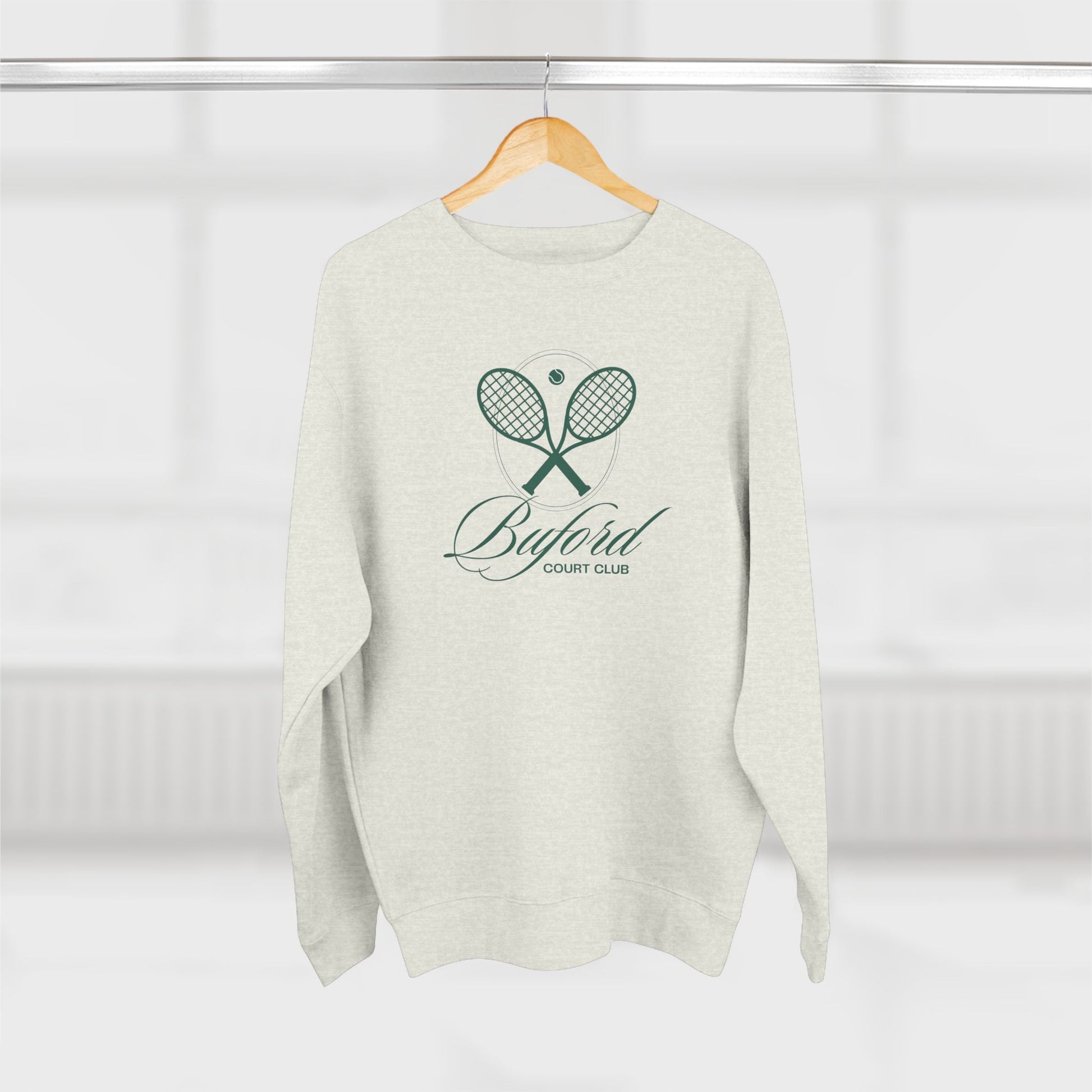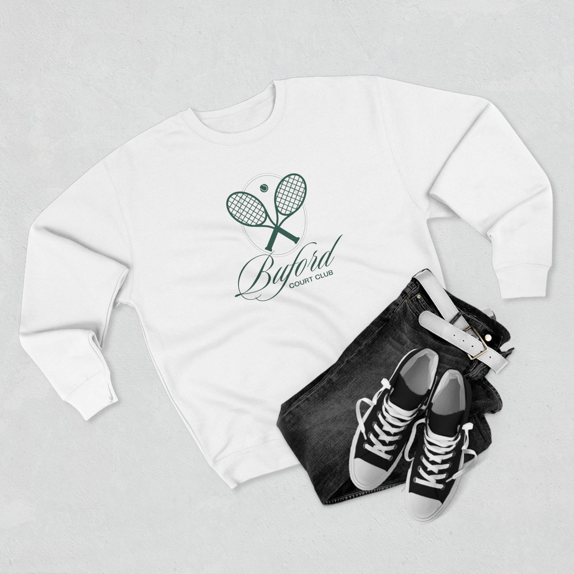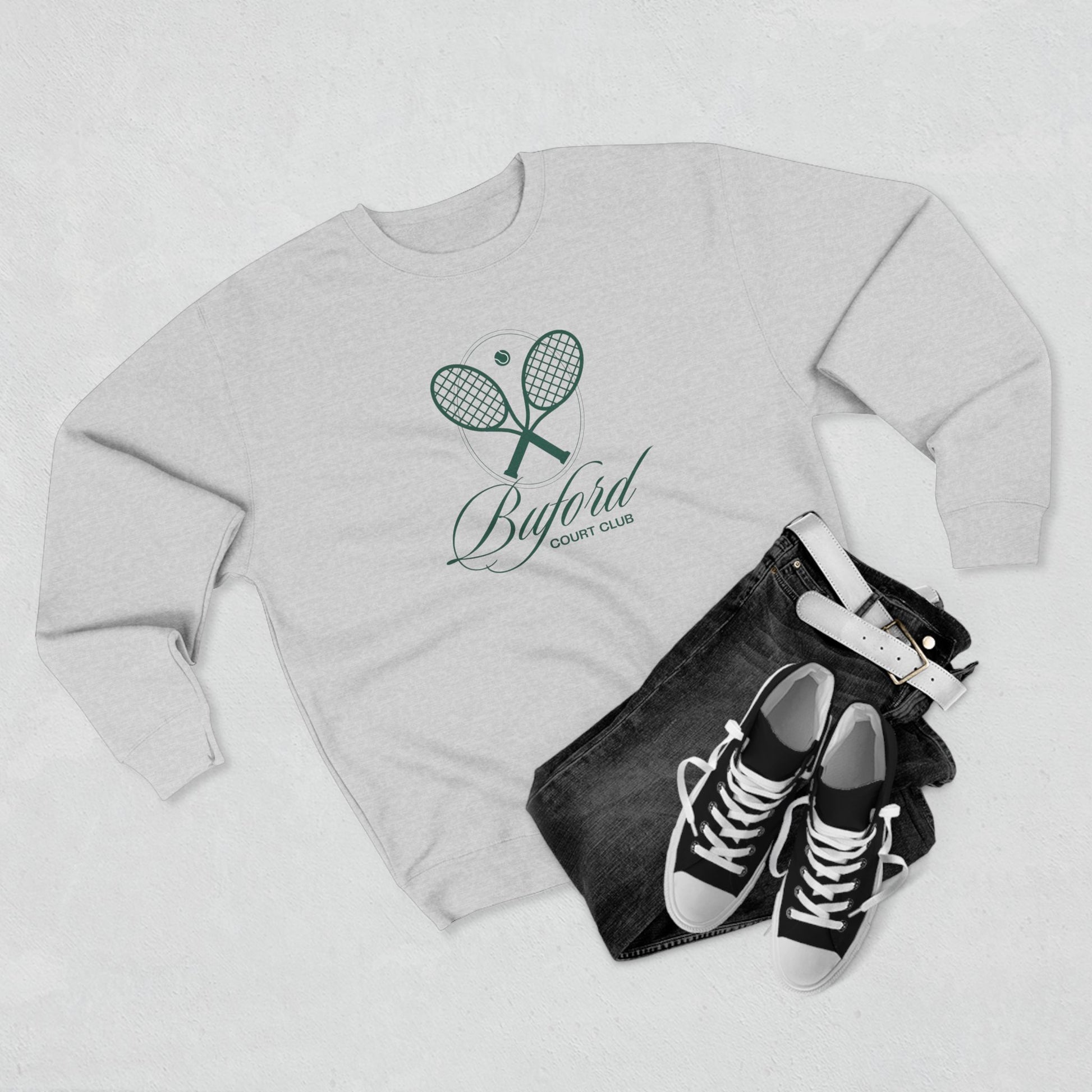 A classic sport meets effortless style. The Buford Court Club crewneck brings a refined take on tennis spirit wear, featuring crossed racquets and timeless lettering in a darker Buford green.