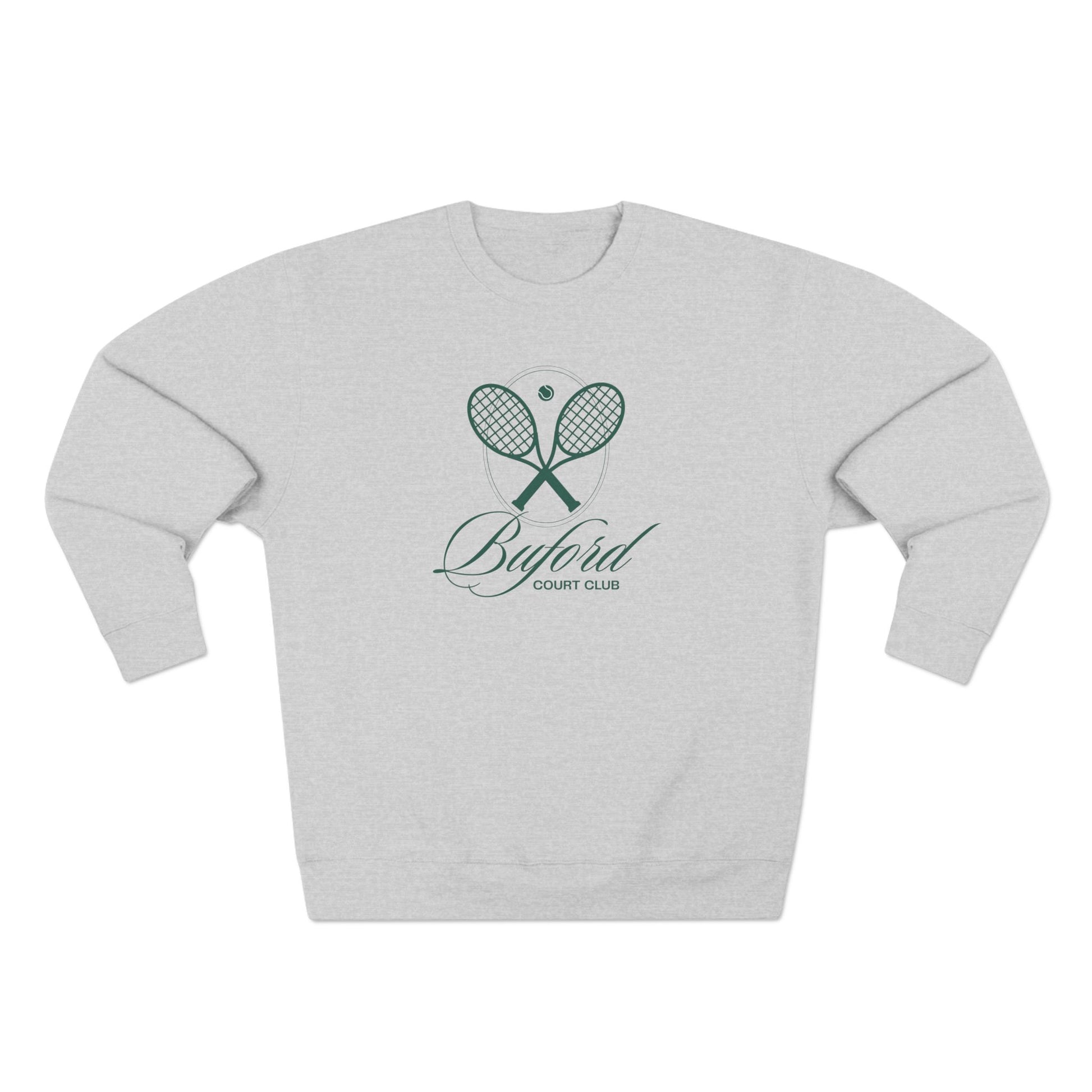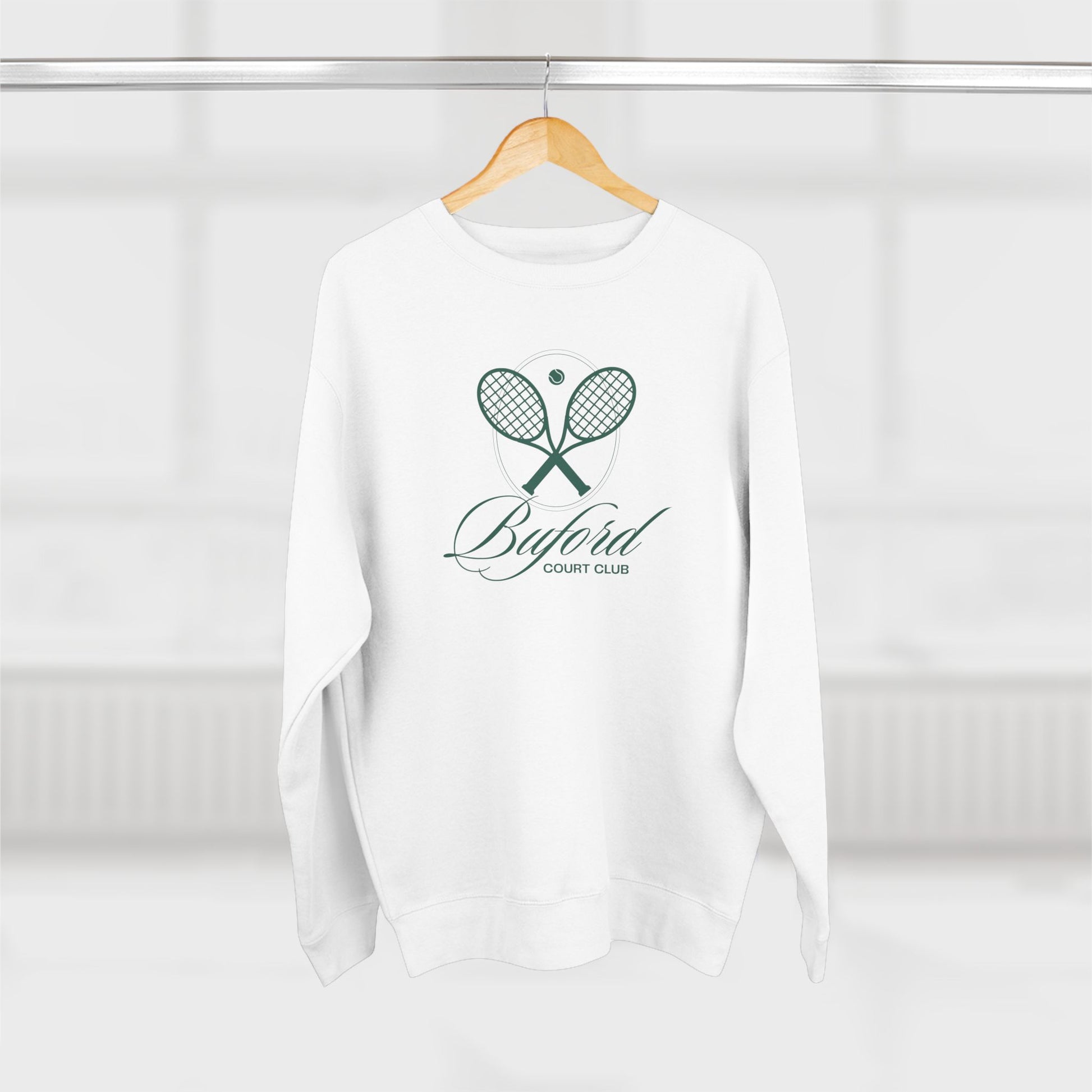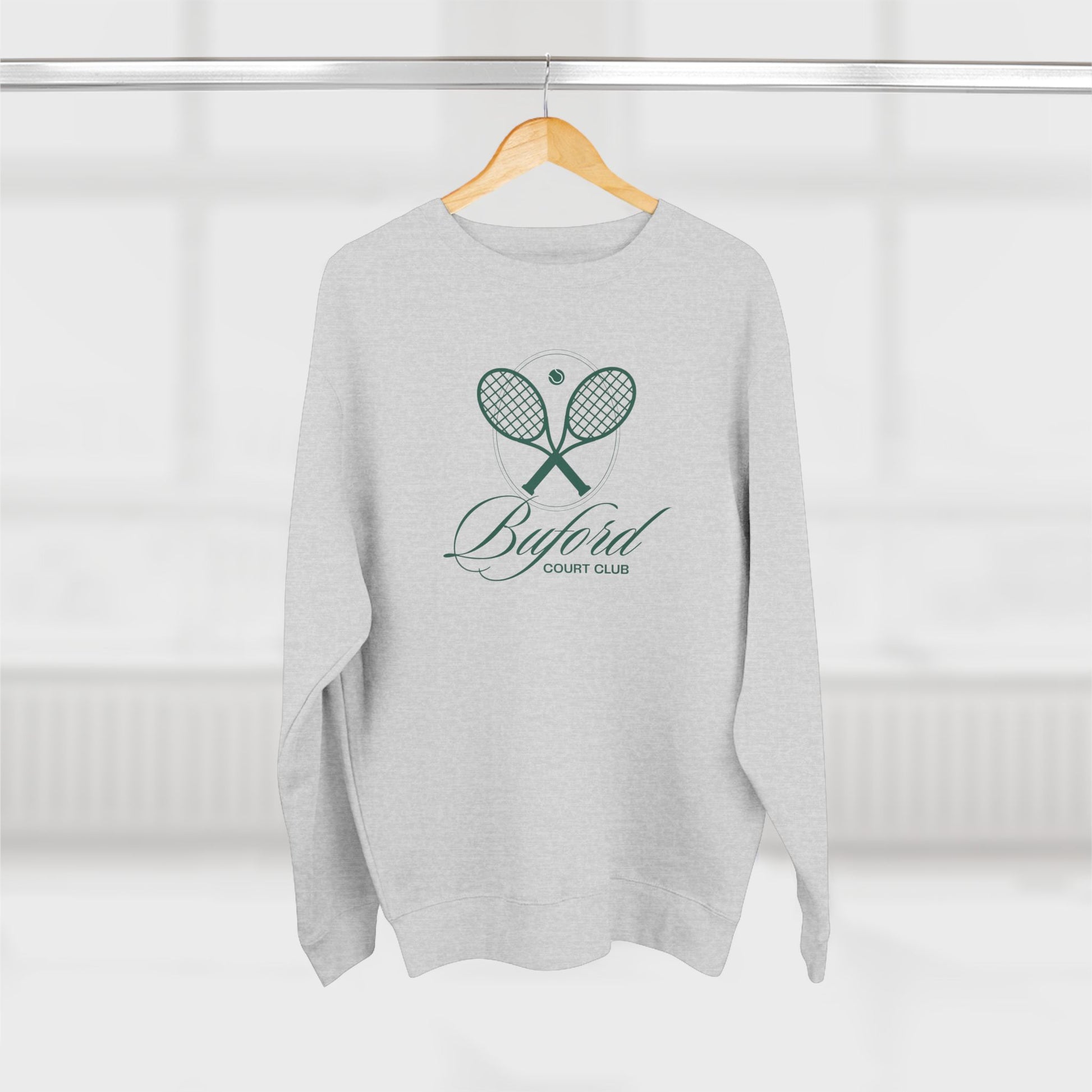 A classic sport meets effortless style. The Buford Court Club crewneck brings a refined take on tennis spirit wear, featuring crossed racquets and timeless lettering in a darker Buford green.