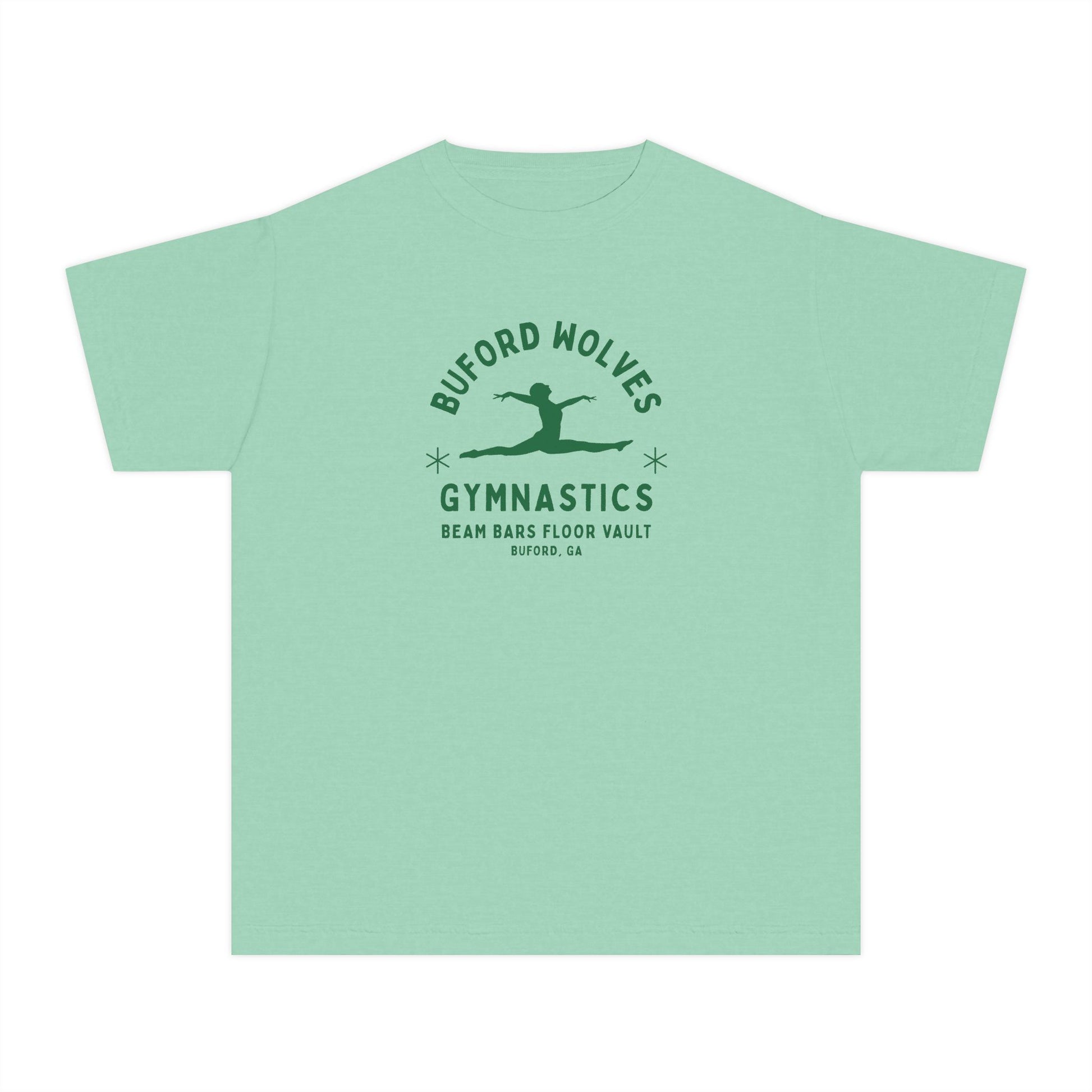 Rep your Wolves pride in the gym and beyond! This lightweight Comfort Colors tee was made for our youngest athletes and fans. Featuring a clean, vintage-inspired Buford Wolves Gymnastics design in classic green, it’s perfect for practice days, pep rallies, or just cheering loud from the stands. Soft, durable, and spirit-approved — because loud looks good on you, even when you’re flipping.